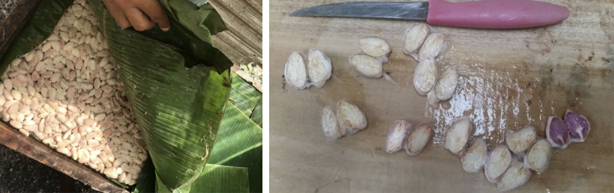 De gauche à droite : Baba mis en fermentation – fèves de cacao fraîches et non fermentées coupées en deux, habituellement violettes, celles-ci sont parfois blanches pour certaines variétés