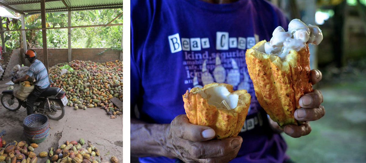 De gauche à droite : Cabosses de cacao récoltées et prêtes à être ouvertes, Bà Rịa, Vietnam - Cabosse de cacao ouverte, les fèves de cacao y sont enrobées d’un mucilage blanc : la pulpe du fruit du cacao, Rio Dulce, Guatemala