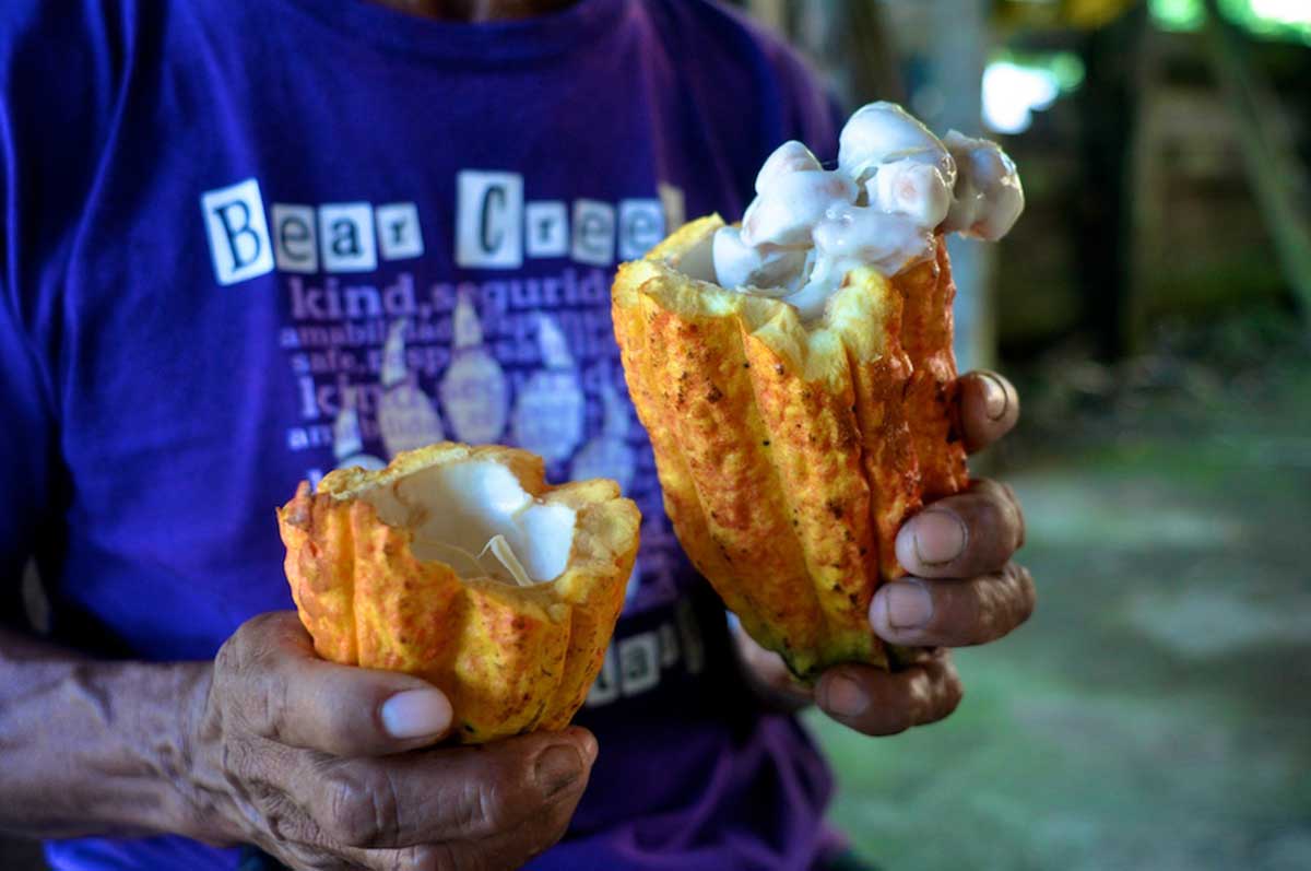 Le fruit d’un cacaoyer est une cabosse dans laquelle on trouve un mucilage blanc, juteux, sucré, aux saveurs proches du litchi ou de la poire. Ce mucilage enrobe une quarantaine de graines attachées en grappe autour d’un placenta central. Ce sont ces graines qui sont utilisées dans la fabrication du chocolat… mais avant d’en faire du chocolat, il y a un petit peu de travail!